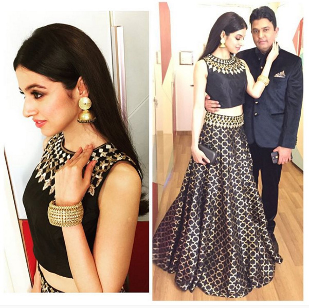6. She was looking super stunning in the black golden crop Top and lehenga with chunky earrings.