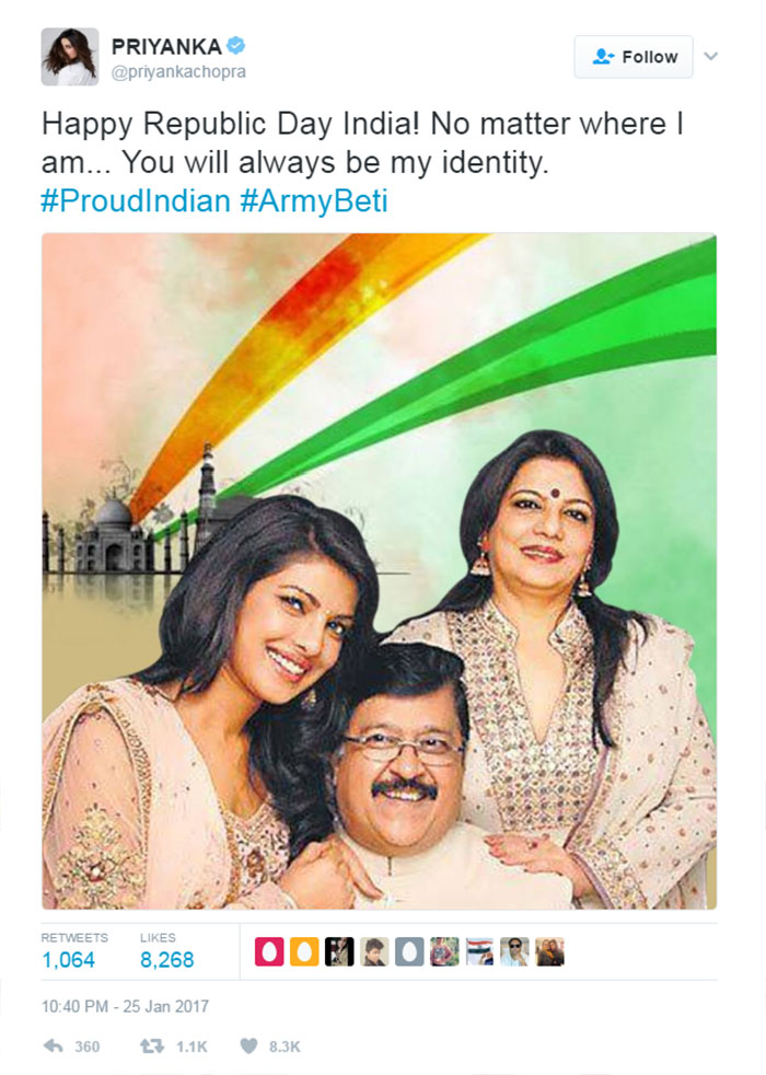 That happened on this Republic Day and she proved all the critics wrong about her with just one tweet. Priyanka Chopra tweeted – “Happy Republic Day India! No matter where I am, you will always be my identity. #ProudIndian #ArmyBeti”. Along with that, she also shared a picture with her father and mother that was adorable to another level.
