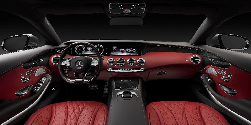 The interior comes almost directly from the S-Class sedan, with sporty additions like additional metal trim and optional Bengal Red leather interior. The touchpad for entering data into the infotainment system from the S65 AMG is standard, and its head-up display is optional. A standard panoramic sunroof exposes two-thirds of the interior and uses Mercedes’ Magic Sky Control technology to switch from transparent to opaque at the touch of a button.