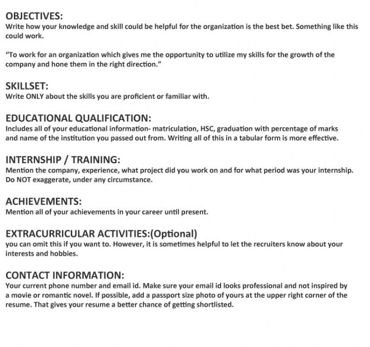 The contents of your resume should be relevant to the industry you’re applying in. For example, if you’re applying for an IT job, writing about your singing and dancing in skill sets would be inappropriate. You may mention your achievements at the end, but do not highlight it. While writing your contact information write only what is needed. You need not write about your marital status, gender and Facebook profile link.