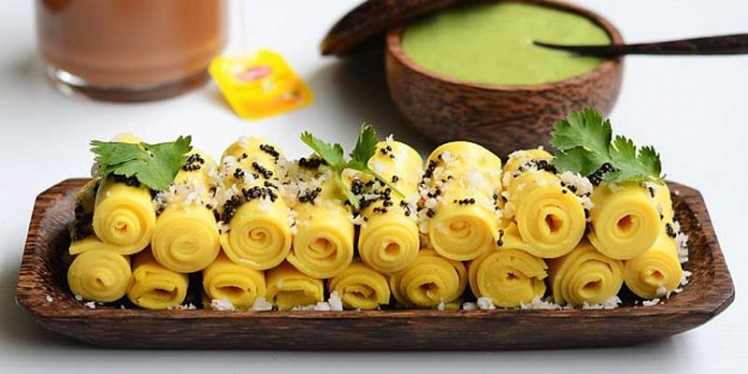 Khadavi is popular, mouth watering, traditional, guilt free, authentic snack from Gujrat. Main ingradients are gram flour and curd. The khandavi rolls are tempered with cumin seeds, asafortida, sesame seeds, mustered seeds, curry leaves, cillies, and sprinked with coconut, corriader, cumin seeds. It is said that it is little difficult item to prepare. It requires lots of patience to be perfected.