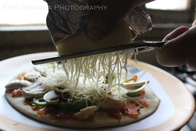 4. Grate just a little bit of mozzarella cheese, covering the entire area of the base (including the ends) and nicely place the toppings on it.