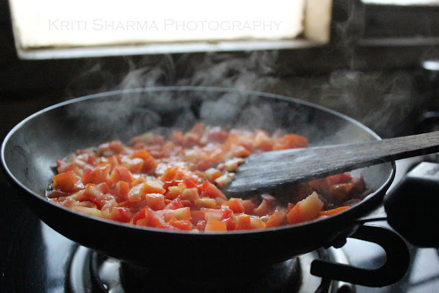 1. Base sauce: Heat a teaspoon of olive oil in a pan and saute the finely chopped tomatoes. Add fresh basil leaves and a pinch of salt and pepper when the tomatoes turn soft and mix well.