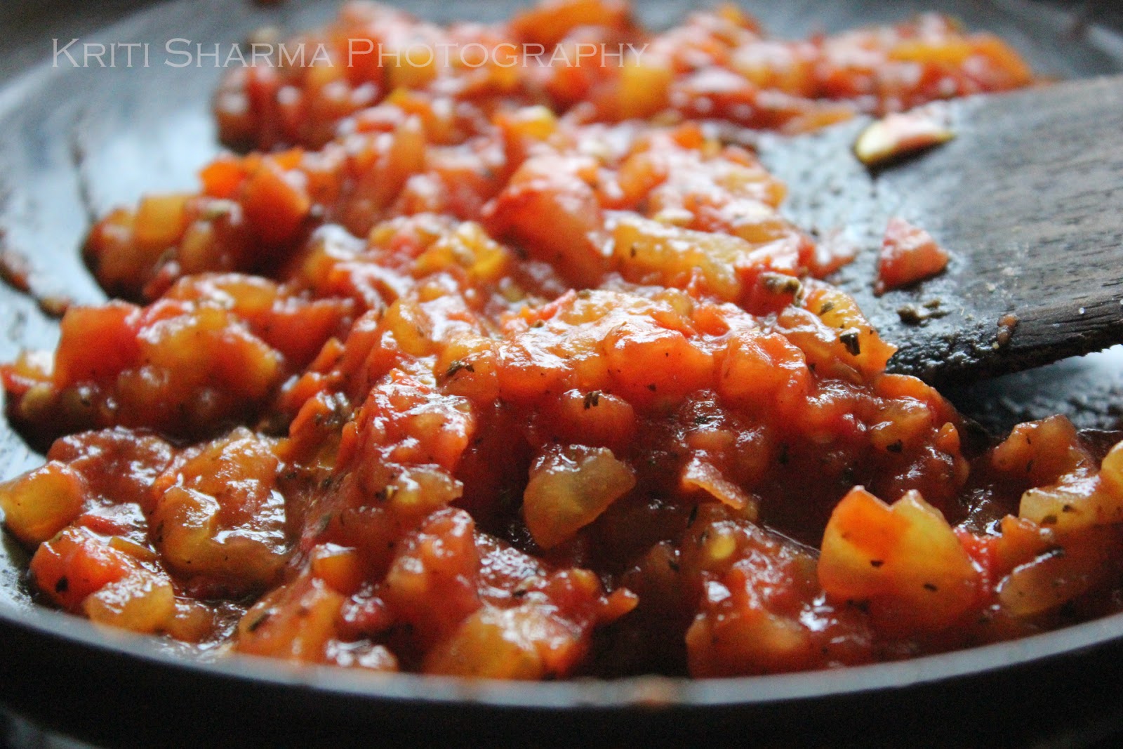 3. Dab the pizza base with some olive oil or butter and spread the freshly made tomato sauce on it.