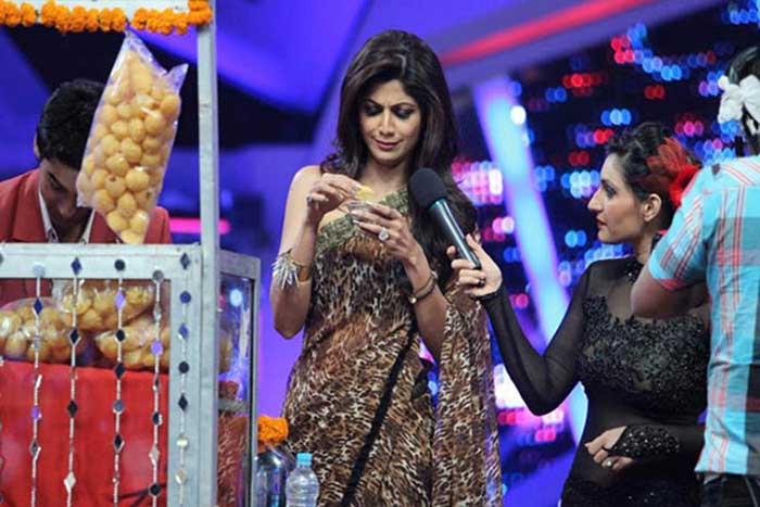 2 एक टेलीविजन शो के दौरान शिल्पा शेट्टी पानी पूरी टेस्ट करती हुईं।