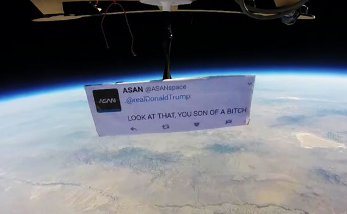 ऑटोनोमस स्पेस एजेंसी नेटवर्क (ASAN) नाम की इस संस्था ने धरती से 90,000 फीट की ऊंचाई पर एक ट्वीट के जरिए अंतरिक्ष में ट्रंप के खिलाफ विरोध प्रदर्शन करके संदेश भेजने की कोशिश किया.