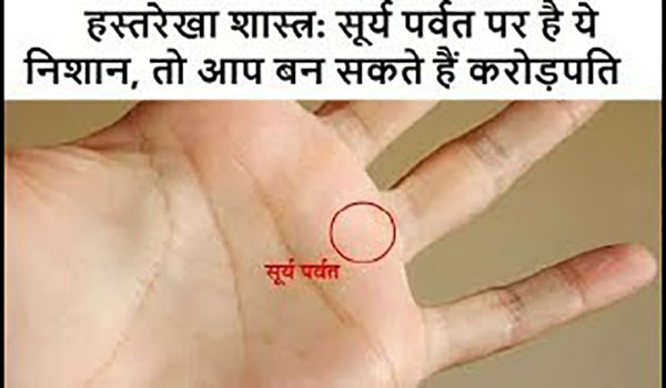 हाथों की रेखायें – अनामिका ऊंगली के मूल में सूर्य का स्थान होता है। जितना ज्यादा सूर्य का उभार होगा प्रभाव उतना ही ज्यादा रहेगा। सूर्य पर्वत का उभार स्पष्ट, अच्छा होने के साथ सूर्य रेखा हो तो वह व्यक्ति श्रेष्ठ प्रशासक, पुलिसकर्मी और सफल उद्योगपति बनता है। अगर सूर्य या शुक्र पर्वत उभार वाले हैं तो विपरीत लिंग के प्रति शीघ्र एवं स्थायी प्रभाव डालने वाला धनवान, परोपकारी, सफल प्रशासक, रूपवान और विलासिता प्रिय बनता है।