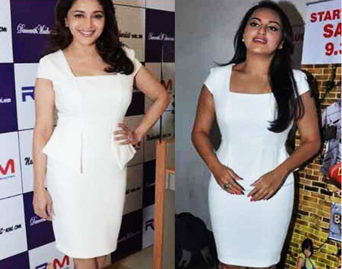 1 – माधुरी की मिलती जुलती वाइट ड्रेस को सोनाक्षी ने एक टीवी शो के दौरान पहना था
