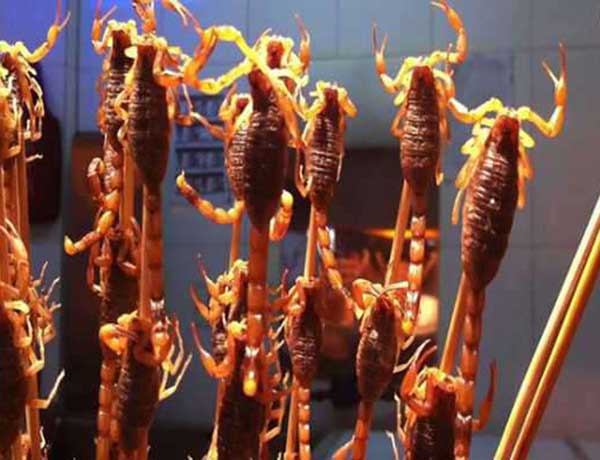चीन में बकरा, मुर्गा, गाय, भैंस, भेड़, सूअर, गधा सब खाया जाता है. चीन के कई इलाकों में सांप भी खाया जाता है. प्राचीनकाल में चीन के राजघरानों में भालू के पंजे का खास अचार बनाया जाता था.जिसे राजा-महाराजा बड़े चाव से खाते थे. लेकिन अब इस पर बैन लग गया है. इसके अलावा चीन में बिच्छू की एक खास मिठाई बनाई जाती है. सर्दियों के मौसम में इसे बड़ी तादाद में लोग खाते हैं. इस मिठाई को बनाने के लिये पहले बिच्छू का डंक निकाला जाता है इसके बाद लोग उन्हें मारकर सुखाते हैं. फिर बिच्छू को कड़ाही में तला जाता है. एक खास प्रक्रिया के बाद यह खाने के लिए पेश किया जाता है. दरअसल यह चीन की प्राचीन मिठाई है. इसे बच्चों से लेकर बूढ़े तक हर कोई पसंद करता है.