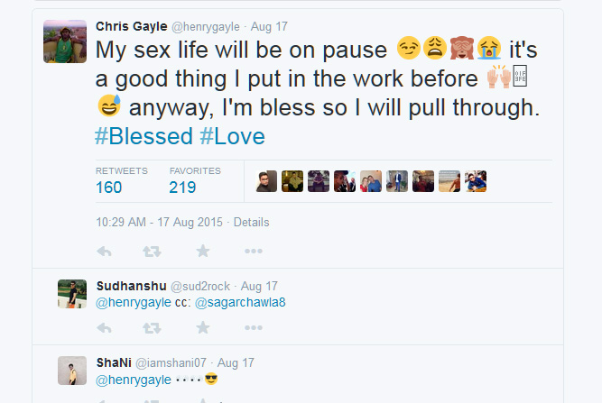 क्रिस गेल को डॉक्टरों द्वारा जब यह फरमान सुनाया गया तो सेक्स को लेकर इस मनाही के बारे में उन्होंने अपना यह दुःख ट्वीटर पर अपने एक ट्वीट से ज़ाहिर किया. क्रिस गेल ने लिखा कि “मेरी सेक्स लाइफ में अब लगाम लग जाएगी. ये अच्छी बात हैं. अब मैं अपने काम को प्रमुखता दे पाउँगा” क्रिस ने अपनी इस बात में कुछ स्माइल का भी इस्तेमाल किया, जिसके ज़रिये यह पता चला कि क्रिस इस बात से थोड़े दुखी ज़रूर हैं लेकिन खेल में ज्यादा ध्यान दे पाने की बात को लेकर क्रिस ने एक हंसती हुई स्माइली भी उपलोड कर के अपनी ख़ुशी जताई.
