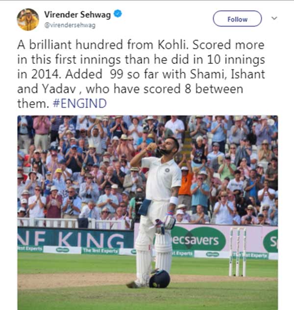 इससे पहले इंग्लैंड में विराट कोहली के द्वारा पहली पारी में लगाए गए शतक को लेकर सहवाग ने ट्वीट किया था. जिसमें उन्होंने लिखा “विराट कोहली द्वारा एक शानदार शतक. उन्होंने अपनी पहली इनिंग में ही इतने रन बना दिए, जितने वाल 2014 में अपनी 10 पारियों में नहीं बना पाए थे.