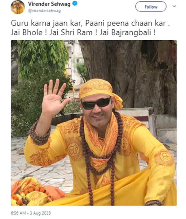 दरअसल, मुल्तान के सुल्तान ने ट्विटर और इंस्टाग्राम पर अपनी प्रोफाइल पिक्चर बदल दी है. इस फोटो में वह साधु या जोगी भेष में नजर आ रहे हैं. आंखों पर चश्मा लगा है पीला वस्त्र धारण किए हुए है. इतना ही नहीं गले में बड़ी-बड़ी रुद्रा की माला भी धारण किये हुए हैं. सहवाग ने इस तस्वीर के साथ कैप्शन में लिखा है , ‘गुरु करना जान कर, पानी पीना छान कर. जय भोले, जय श्रीराम, जय बजरंगबली.’