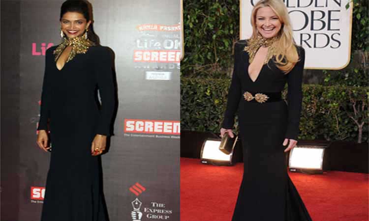 अमेरिकन एक्ट्रेस केट हडसन गोल्डन ब्लैक फिश कट गाउन में जितनी खूबसूरत नजर आ रही हैं उतनी ही हसीन दीपिका भी लग रही हैं. स्क्रीन अवॉर्ड के दौरान दीपिका ने केट हडसन जैसी गाउन पहनी थी सिर्फ एक बेल्ट का ही फर्क था.
