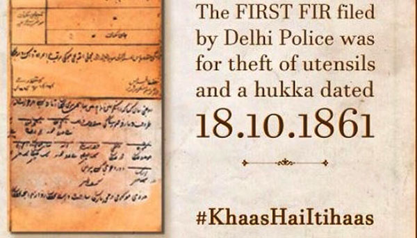 कुछ समय पहले दिल्ली पुलिस के द्वारा एक ट्वीट किया गया जिसमें दिल्ली पुलिस द्वारा दर्ज की गई फर्स्ट FIR (फर्स्ट इनफार्मेशन रिपोर्ट) का जिक्र किया गया है। यह पहली प्राथमिकी आज से 157 साल पहले 18 अक्टूबर 1861 को दिल्ली पुलिस द्वारा उर्दू भाषा में दर्ज की गई थी। यह फर्स्ट FIR बर्तन और हुक्का चोरी के बारे में है।
