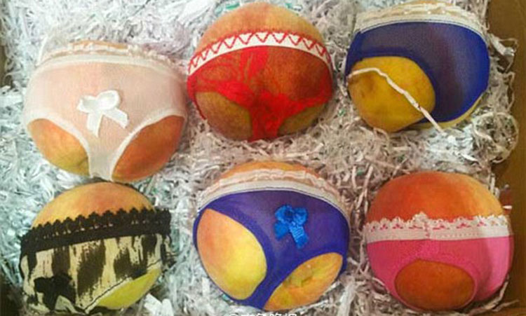 पूर्वी चीन के किंगदाओ में स्थित एक सुपरमार्केट में फलों को बेचनेवाले एक शख्स ने फलों को बेचने का एक अनोखा तरीका निकाला है. उसने पेटी में भरी हुई लगभग सभी पीच फलों को पैंटी पहनाकर अनोखे ढंग से सजाया. फिर उसे इस सुपरमार्केट में बेचने के लिए पहुंच गया.