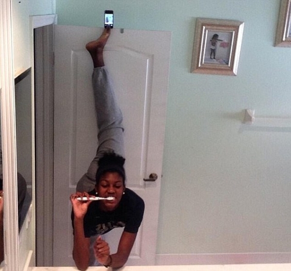 इन मोहतरमा को देखिए ज़रा. इन्हें ब्रश करते समय भी ये पोज़ सूझ रहा है. इन्हें लगा होगा कि सेल्फी लेने का ये तरीका किसी और ने नहीं आजमाया होगा. सच हैं आप महान हैं. उससे भी महान आपके ये पैर हैं जो इतनी म्हणत कर रहे हैं. पैरों से सेल्फी लेती हुई लड़की को आपने इससे पहले कभी नहीं देखा होगा. आज देख लीजिये.
