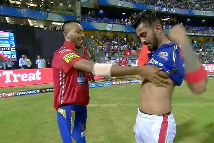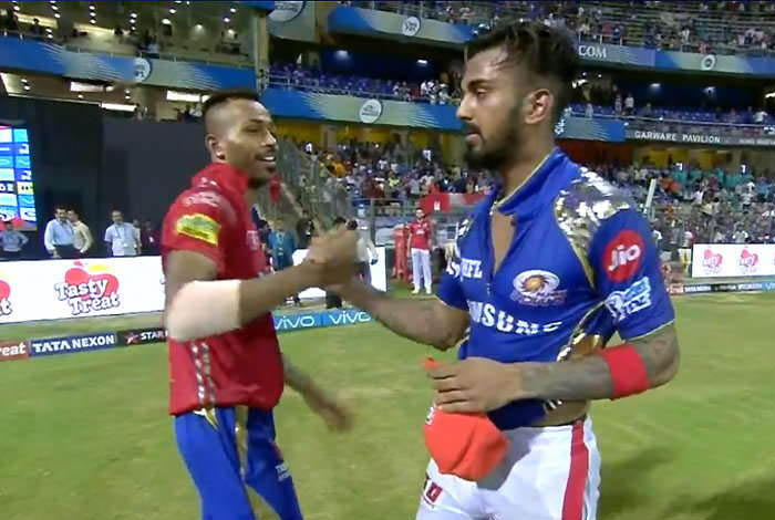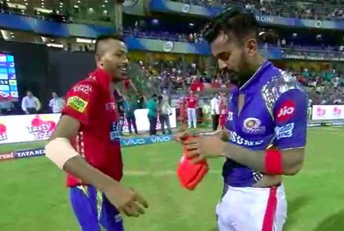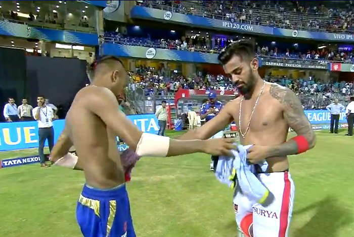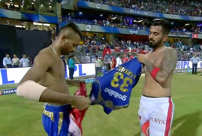 ये देखिए कैसे इस फोटो में दोनों एक दूसरे के टी शर्ट बदल रहे हैं. मैच खत्म होने के बाद राहुल और हार्दिक ने एक-दूसरे की जर्सी बदली और हार्दिक पंड्या ने पंजाब की और राहुल ने मुंबई इंडियन की टीशर्ट पहनकर अच्छे दोस्त होनी का संदेश दिया है.