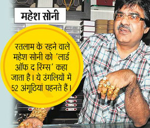 ये सज्जन रतलाम शहर के चांदिनी चौक इलाके से है. ये अपनी उँगलियों में कुल 52 अंगुठिया पहनते है, जिनकी किमत डेढ़ करोड़ रूपये से भी जयादा है. दिल्ली में इन्हें लोग लार्ड ऑफ़ रिंग्स के नाम से जानते है.