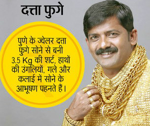 ये सज्जन महाराष्ट्र राज्य के पिंपरी-चिंचवड जिले के निवासी है. जिले में शुरू से ही इनके बाप-दादा की साहूकारी चलती आ रही है. दत्ता फुगे अपने शरीर पर 7.30 किलो सोना पहनते है. एक महीने पहले इन्हें अंडरवर्ल्ड से पैसो के मांग की धमकी आई थी. तब से इनके साथ हमेशा 20 सेक्युरिटी गार्ड होते है