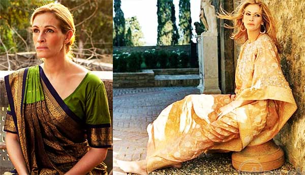 फ़िल्म ईट प्रे लव की शूटिंग के दौरान प्रीटी वुमन जुलिया राबर्ट्स ने ग्रीन कलर की जरी की साड़ी पहनी थी. साथ ही एलो साड़ी में भी वो काफी स्टाईलिश लगी.