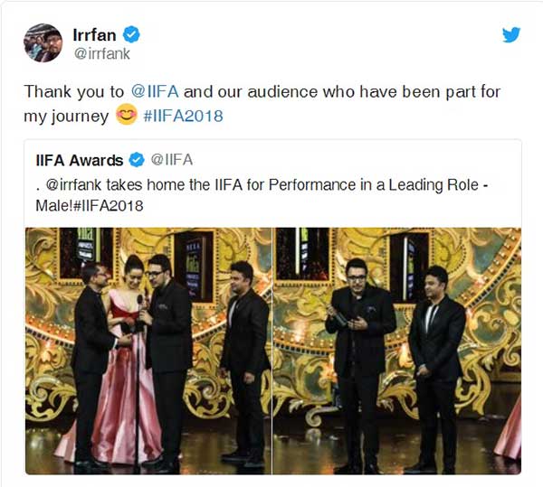 आपकों बता दे कि हाल ही में आइफा अवॉर्ड के दौरान इरफान खान को उनकी फिल्म “हिन्दी मीडियम” के लिए बेस्ट एक्टर अवॉड मिला था। हालांकि अपनी बीमारी और उसके इलाज के चलते इरफान इस अवॉड को लेने आइफा अवॉड समारोह में नहीं पहुंच पाये थे, लेकिन अपने इस अवॉड के लिए इरफान खान ने ट्वीट कर अपने फैंस से खुद को बेस्ट एक्टर चुनने के लिए धन्यवाद कहा था।