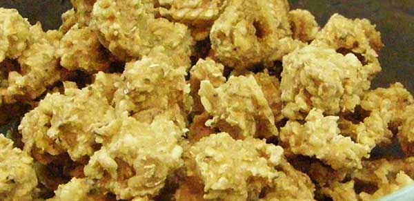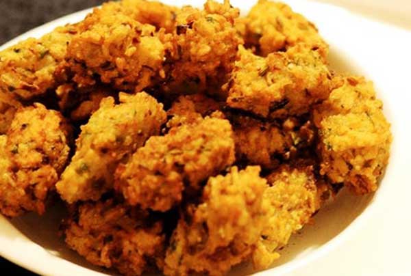 घर में पका हुआ चावल बच गया है तो उसमे बेसन मिलकर चावल अच्छे से मसल दे. दोनों के मिश्रण में थोडा पानी डाले. ध्यान रखें यह मिश्रण गाढ़ा हो. उस मिश्रण में जीरा, नमक, मिर्च, धनिया पावडर स्वादानुसार मिला ले और बारीक कटा प्याज भी मिला दे. चावल और बेसन के घोल में ब्रेड का चूरा बनाकर बराबर मात्रा में उस गाढे मिश्रण में मिला ले और फिर तेल गरम कर पकौड़े की तरह बनाकर तेल में तल कर सबको चाय या काफी के साथ गरमा गरम परोसे.