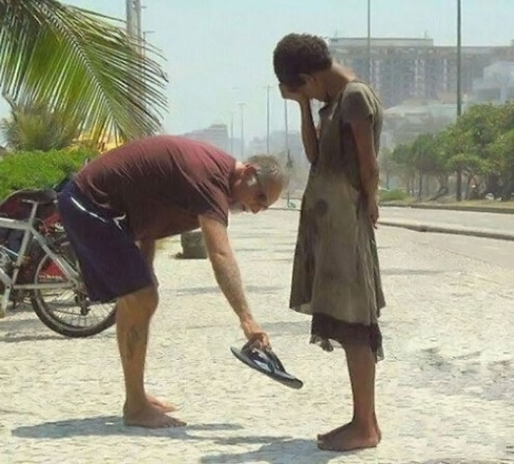 1 . कड़ी धुप में एक बुजुर्ग एक भिखारन को अपनी चप्पल देते हुए.