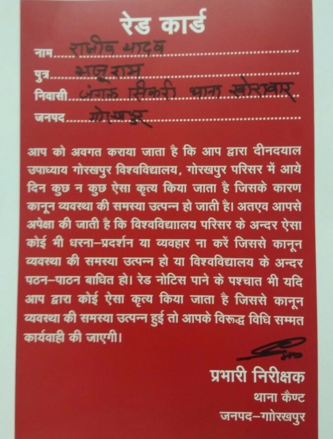 दीनदयाल यूनिवर्सिटी में धरने और हंगामा करने वाले यूनिवर्सिटी के छात्र नेताओं और अराजक तत्वों से परेशान होकर पुलिस ने रेड कार्ड नोटिस जारी किया है। पुलिस ने नोटिस जारी करने से पहले छात्रों को लिखित तौर पर चेतावनी भी दी थी, लेकिन छात्र नेता दल ने ना ही पुलिस की चेतावनी को सीरियस नहीं लिया और ना ही हंगामा करना बंद किया। जिसके बाद गुरूवार को कैंट पुलिस ने गोरखपुर यूनिवर्सिटी में अराजकता और हंगामा करने वाले 20 छात्रों के खिलाफ रेड कार्ड नोटिस जारी कर दिया।