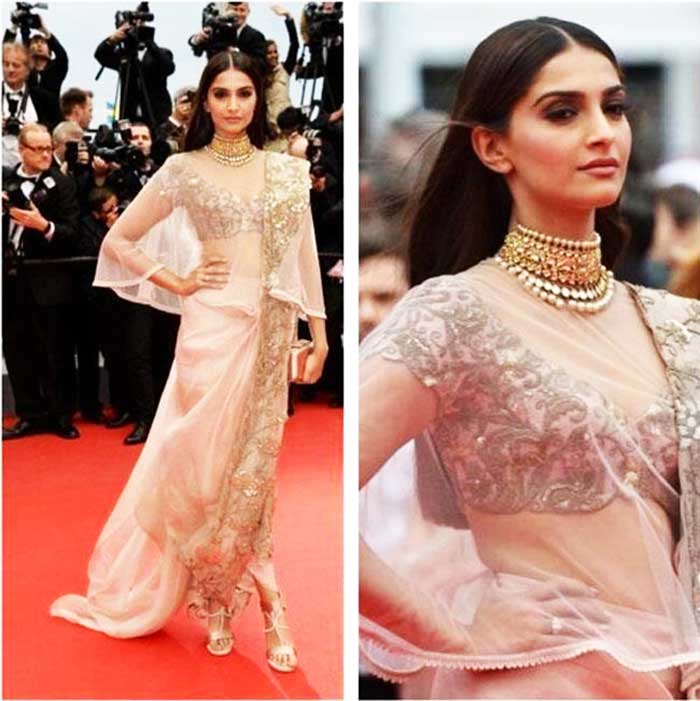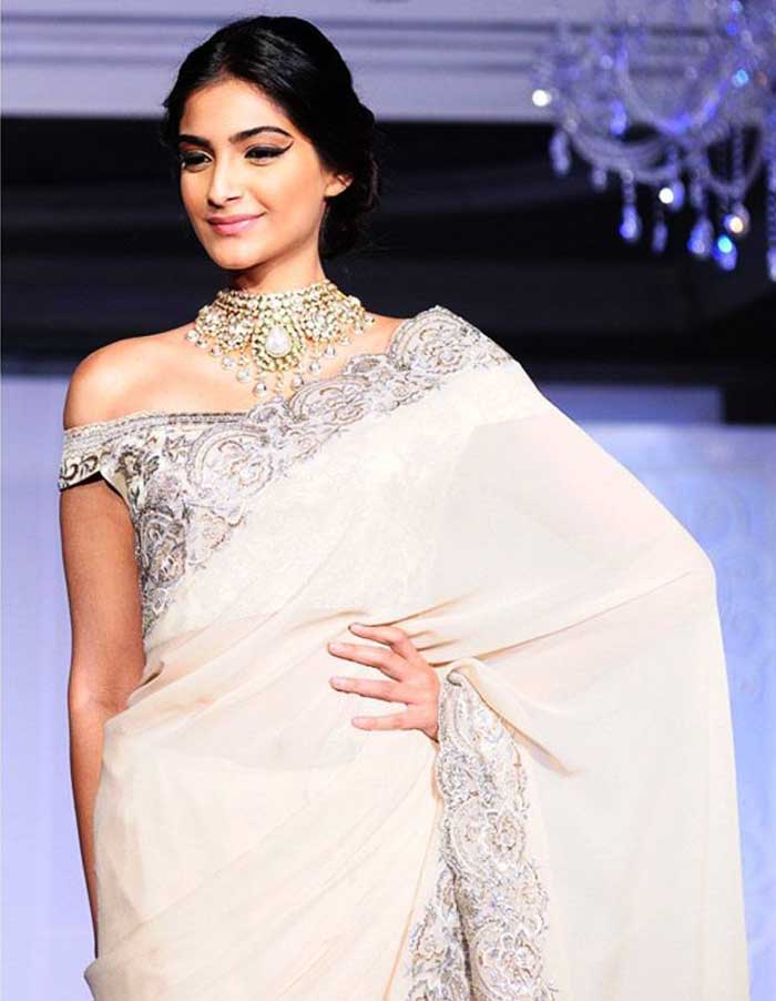 2 – इंडियन जेम्स ज्लैलरी फेयर में सुनीता वर्मा की साड़ी पहने सोनम कपूर। इसमें वो बिना ब्लाउज के साड़ी में दिखाई दी।