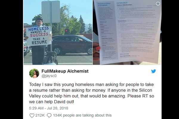 जैसमीन स्कॉफील्ड नाम की एक महिला ने सड़क पर नौकरी मांगते हुए डेविड की तस्वीर उसयके रेज्यूमे के साथ ट्विटर पर शेयर कर दी। इसके बाद सोशल मीडिया ने तो जैसे डेविड की किस्मत ही चमका दी। देखते देखते ये पोस्ट गेट डेविड अ जॉब के हैशटैग के साथ वायरल हो गई और डेविड को गूगल, नेटफ्लिक्स, लिंकडइन समेत 200 बड़ी कंपनियों से जॉब के ऑफर आ गए।