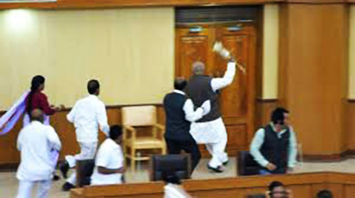 1 – इस तस्वीर में देखिए विधायक जी स्पीकर के आसन के सामने रखे राजदंड जो कि आकार में गदा जैसा है उसको उठाते नजर आ रहें हैं.