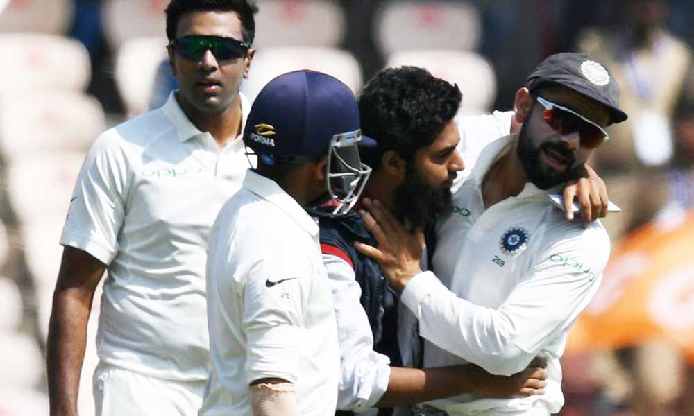 यह घटना हैदराबाद टेस्ट के पहले दिन के सुबह के सेशन में हुई थी। एक घंटे का खेल होने पर एक दर्शक ने बैरिकेड लांघकर विराट की तरफ तेज दौड़ लगाई और जोर से उन्हें गले लगा लिया। इसके बाद उन्होंने विराट कोहली को किस कर सेल्फी लेने की भी कोशिश की। विराट कोहली को भी उस समय कुछ समझ नहीं आया और एक पल के बाद वह बचने लगे। जिसके बाद सुरक्षाकर्मी बीच-बचाव के लिए आए और उस शख्स को बाहर ले गए।