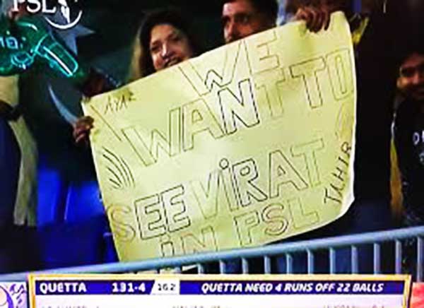 हाल ही में हुए इस्लामाबाद यूनाइटेड और क्वेटाग्लेडिएटर्स के मैच के दौरान दर्शकों के बीच बैठे विराट के फैंस नजर आए. यह फैन अपने हाथ में पोस्टर लिए हुए थे जिसमें लिखा था, ‘हम विराट कोहली को PSL में देखना चाहते हैं.’