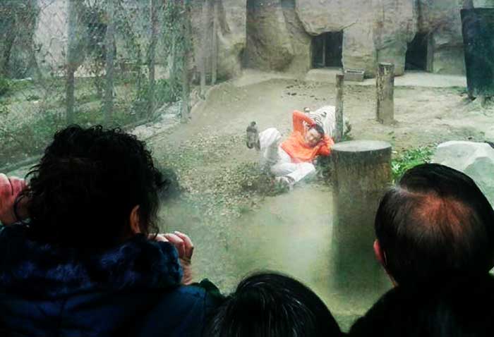 10. जू के अंदर जानवरों से दूर ही रहना चाहिए. लेकिन इस बात को भला इन्सान मानता ही कहाँ है. अब इस इंसान को देखिये जिसने सफ़ेद बाघिन के पिंजरे में जाने की गलती की थी.