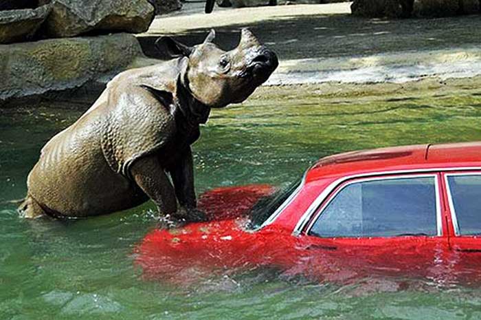 13. गैंडा भी खूंखार जानवर होता है. आप देखिये इसने तो गाड़ी पर ही ऐसा हमला किया है कि गाड़ी को पानी में उतारना पड़ा था लेकिन फिर भी इससे बचना मुश्किल हो गया था.
