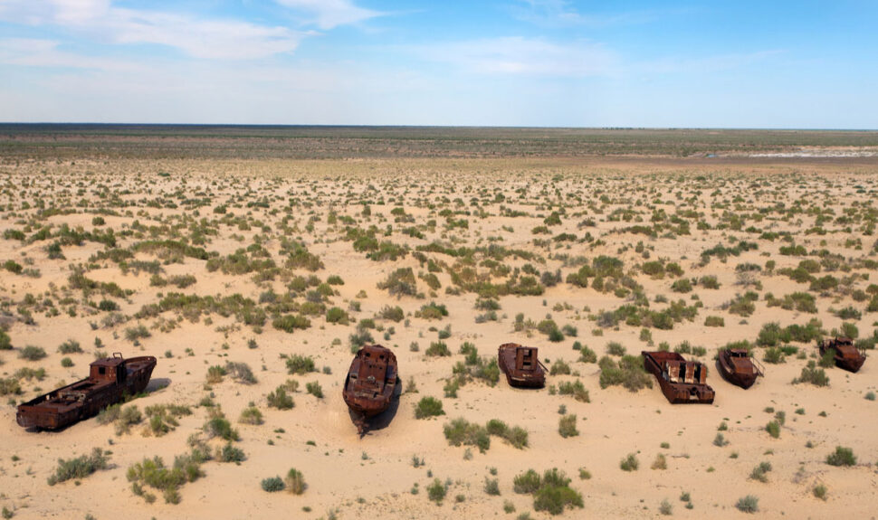 The landscapes of the rusty ships are seen in Uzbekistan, shining brown under the beating heat of the sun. What does the presence of the ships indicate?