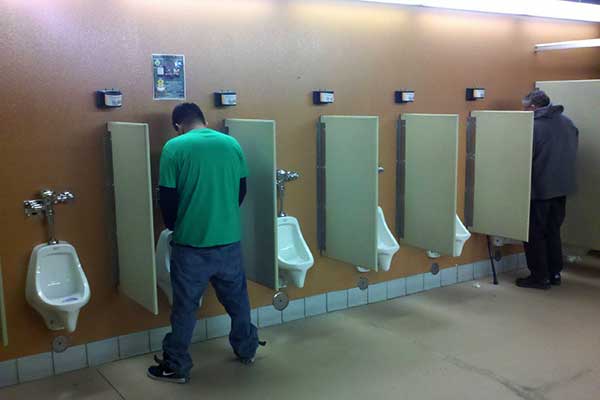 Guys; choose a spot at the urinal farthest from someone already there, or at one end if you are the first. While at the urinal, never turn to look directly or sideways at anyone standing there. Especially, do not look in his direction any lower than his face.Stand close enough to the pan or urinal so you don’t dribble on the floor. Concentrate when you pee so you don’t wet the seat, walls or floor.