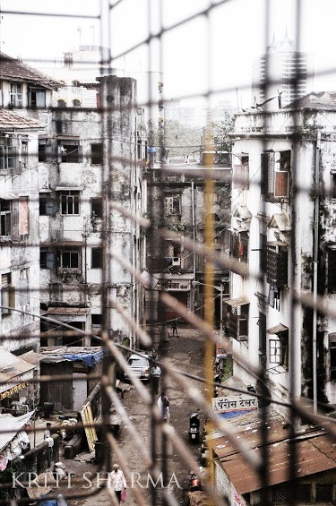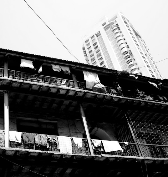 A view of the surrounding chawls and distant skyscrapers in the neighbourhood of Lower Parel. Many chawls are now being brought down to make way for swanky buildings.